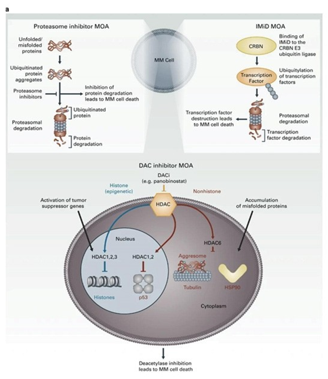 Histone deacetylase inhibitors (HDAC inhibitors) treat multiple myeloma by blocking the action of histone deacetylases, enzymes that remove acetyl groups from histone proteins. This inhibition leads to increased acetylation of histones, resulting in a more relaxed chromatin structure and altered gene expression. The changes in gene expression can trigger cell cycle arrest, apoptosis, and differentiation in myeloma cells. HDAC inhibitors also enhance the effects of other anti-myeloma agents and can modulate the immune response, contributing to their anti-tumor activity. An example of a histone deacetylase inhibitor used in the treatment of multiple myeloma is panobinostat [33].